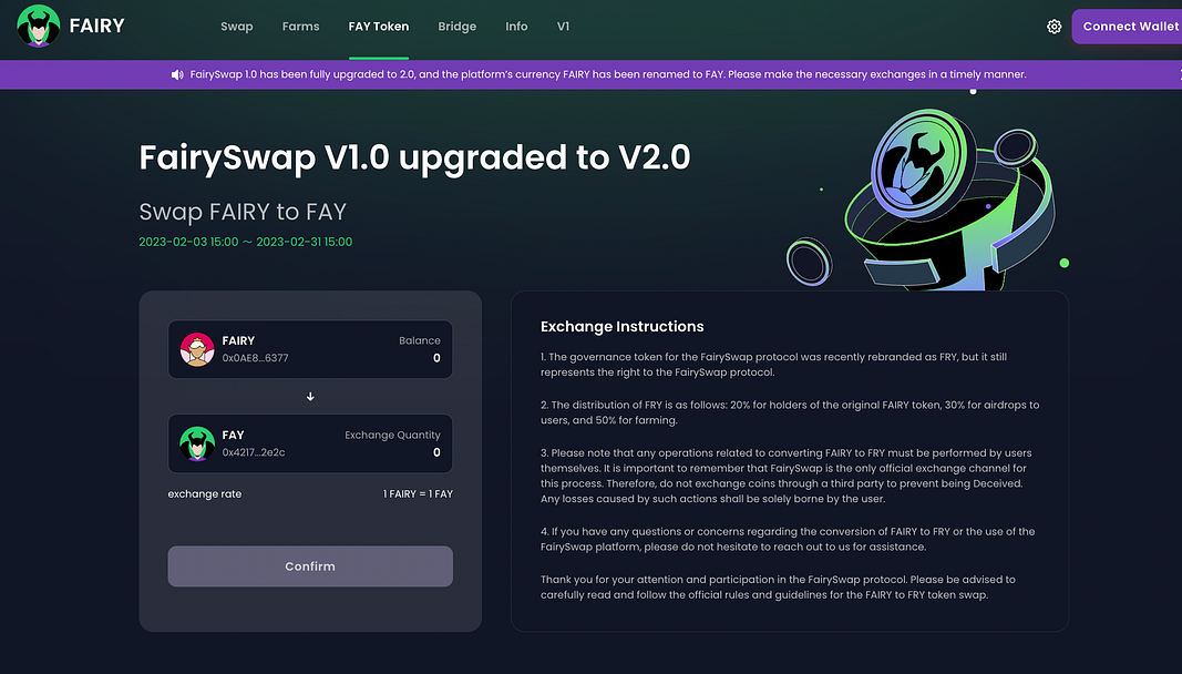 Starting on 2023, March 7th, users can visit fairyswap.finance/fay to exchange their $FAIRY tokens for $FAY tokens or claim their $FAY airdrops. You can check this clear and simple instruction to check the detailed process for the token migration. With $FAY, we are confident that we can offer a safer and more reliable platform for the community to trade and invest in a variety of tokens.