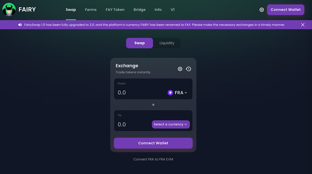 Our redesigned interface will give users a better trading experience. Weâve been taking your feedback to heart and working tirelessly to build a more intuitive, user-friendly platform. Youâll notice some changes when you connect to FairySwap, including a cleaner design and streamlined navigation.