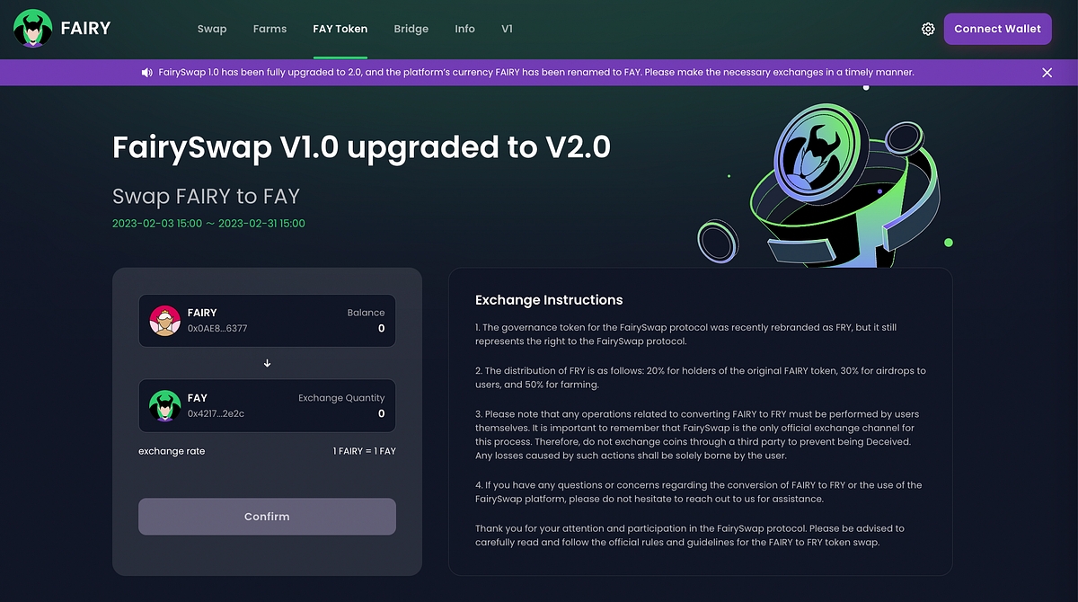 existing tokens holders of $Fairy can exchange their $Fairy token to $FAY token on a 1:1 basis. Please note that any operations related to converting FAIRY to FAY must be performed by the users themselves on Fairyswap’s official website.